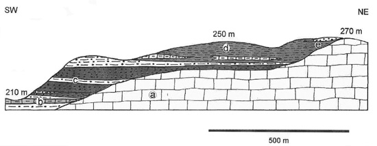 Coupe interprétative de l'affleurement du gisement de Puycelci d'après Astruc et. al. (2003). a : calcaires du Jurassique ; b : molasses oligocènes ; c : galets et graviers ; d : argiles brunes ; e : grès fossilifère.